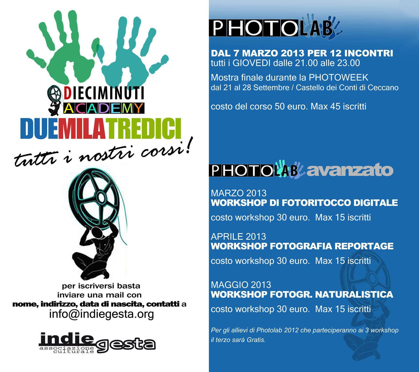 I primi laboratori pronti a partire dal prossimo mese di marzo saranno il PhotoLab Base, un corso di fotografia per principianti che prevede un ciclo di 12 incontri teorico-pratici, 2 escursioni e la realizzazione di una mostra finale presso il Castello dei Conti di Ceccano; novità in ambito fotografico saranno poi i tre workshop che andranno a costituire il PhotoLab Avanzato. I tre workshop saranno così strutturati:
