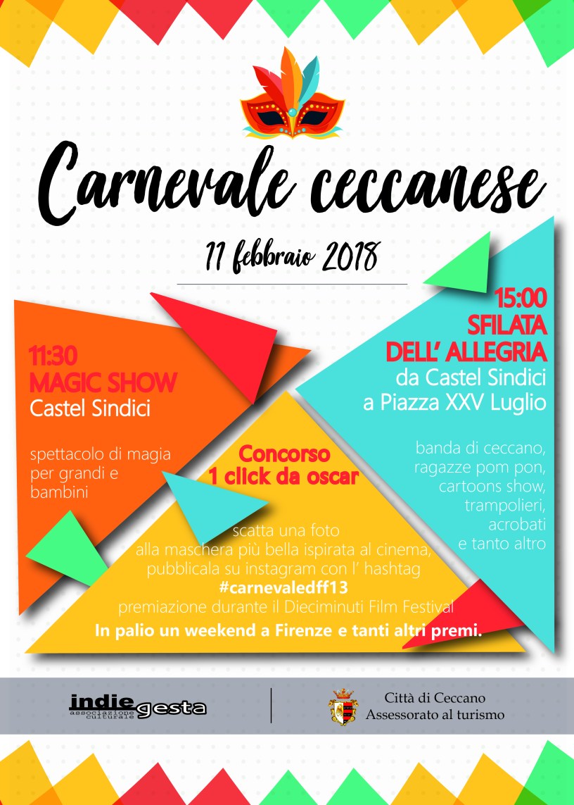 Tornano la Magia e l’Allegria del Carnevale Ceccanese. Domenica 11 febbraio, da Castel Sindici a Piazza XXV Luglio, le strade del centro cittadino saranno invase da maghi, trampolieri, giocolieri, maschere, mimi, comici e tanto altro per un pomeriggio di festa.