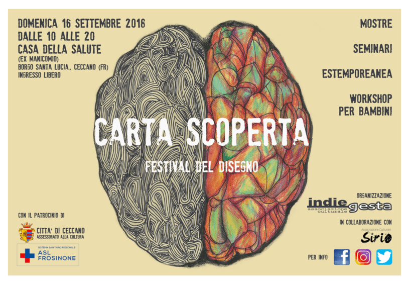 Mai percorrere strade troppo facili o troppo corte, si finisce per diventare pigri. Carta Scoperta, il nome che abbiamo scelto per il nostro primo Festival del Disegno, punta a diventare un esperimento culturale futurista che punta a valorizzare e scoprire una delle arti più antiche del mondo, il disegno. Domenica 16 settembre, dalle 10 alle 20 nella nuova, insolita ma affascinante cornice del Chiostro della Casa della Salute di Ceccano (l’ex Manicomio), vi proporremo un viaggio alla riscoperta di un’arte che, nonostante l’arrivo del digitale, è più viva che mai.
