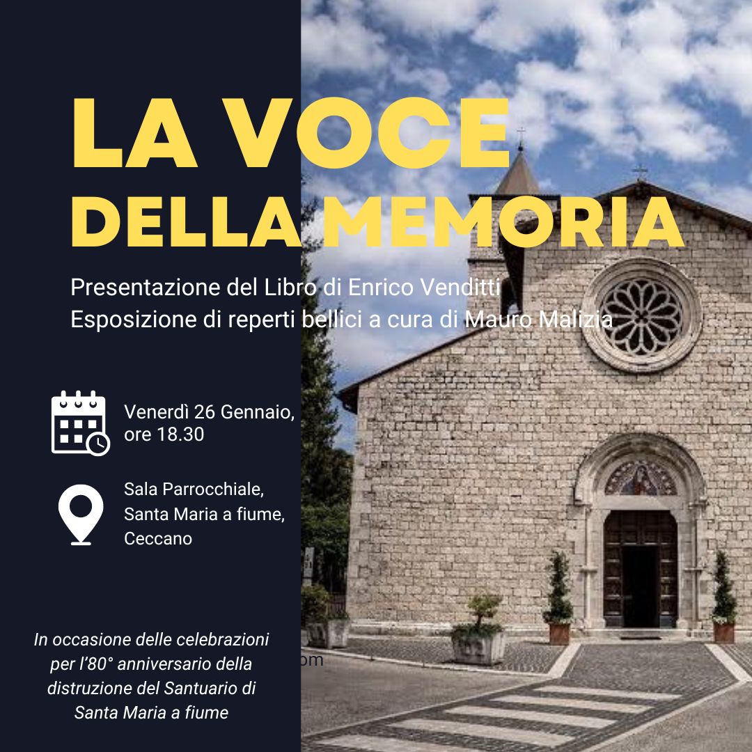 Venerdì 26 gennaio, dalle ore 18 presso il Salone Parrocchiale del Santuario di Santa Maria a Fiume, avrà luogo la presentazione del volume La Voce della Memoria, una raccolta di testimonianze sulla Seconda Guerra Mondiale curato da Enrico Venditti. Contestualmente, saranno esposti alcuni dei reperti più importanti delle attività di ricerca sul territorio ceccanese dello stesso Enrico e di Mauro Malizia, curatore dell’esposizione.