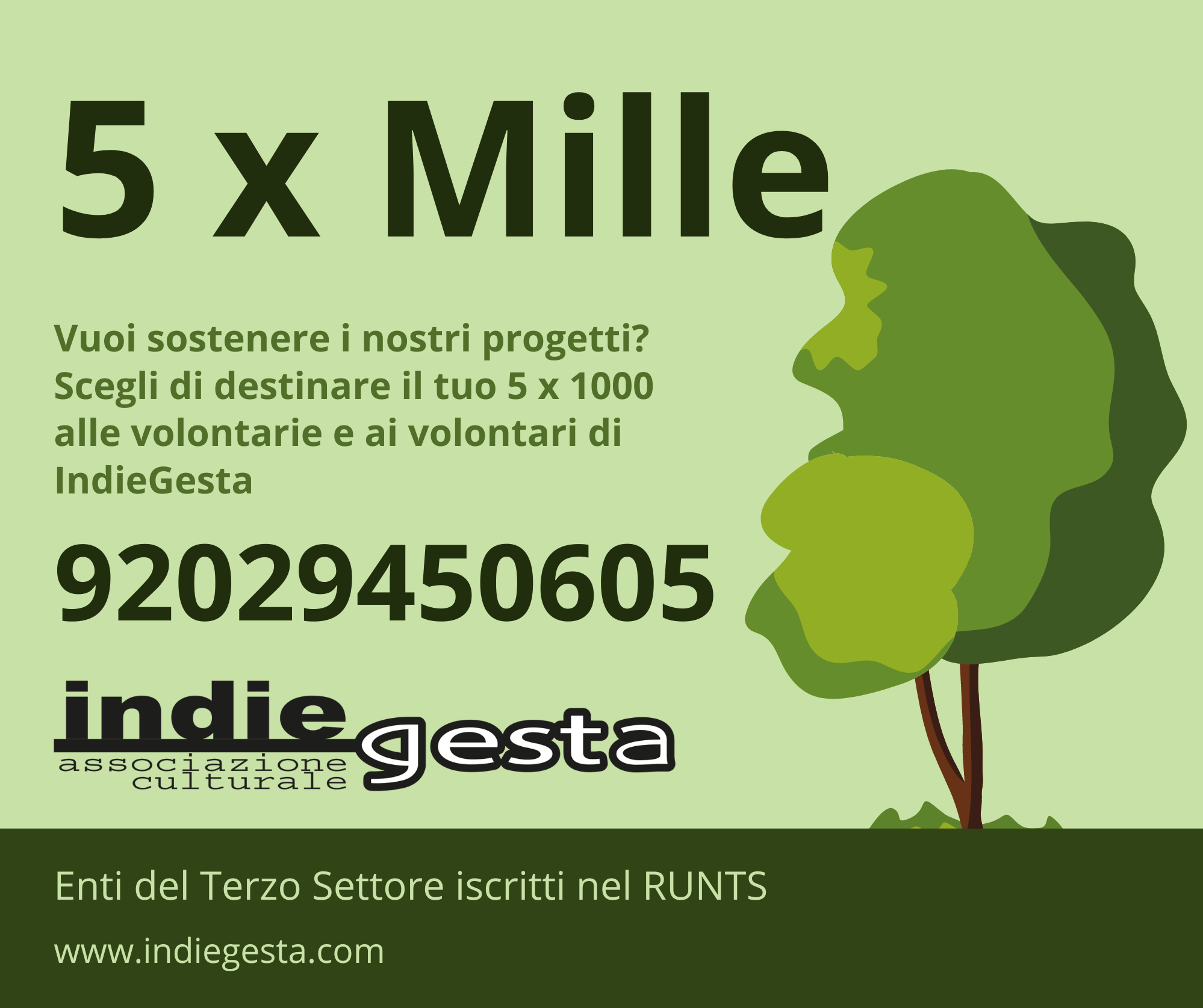 Il nostro codice fiscale è 92029450605, il campo in cui inserirlo è quello destinato agli Enti del Terzo Settore iscritti nel RUNTS. Ringraziamo fin da ora tutti coloro che, con una semplice firma, ci aiuteranno a portare avanti le nostre idee per il futuro.