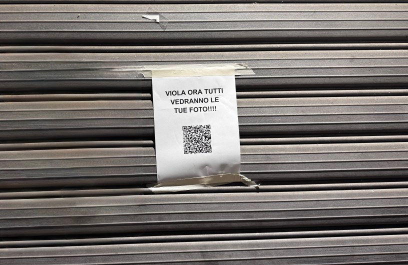 Sotto, un QR code. Chi lo inquadra – credendo di trovare materiale compromettente – viene indirizzato su una pagina web che esordisce così: “Le tue foto sono al sicuro. Le sue, no.”